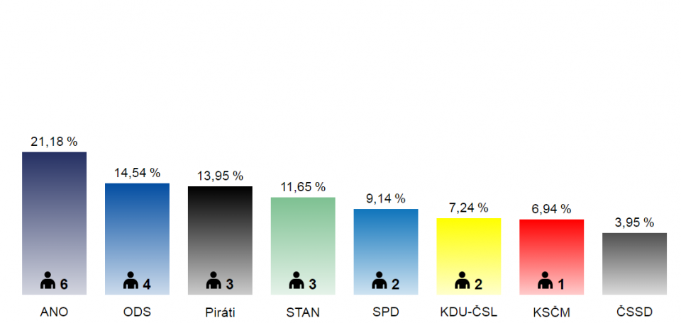 V Ústeckém kraji se vedle hnutí ANO, ODS a Pirátů podařilo získat víc než pět procent hlasů také SPD, KSČM a koalici STAN a TOP 09.