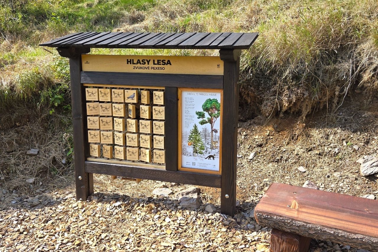 Na dalším zastavení si zacvičíte podle zvířat, porovnáte rozpětí svých paží s rozpětím křídel ptáků, zaposloucháte se do rozeznělých druhů dřeva a také nahlédnete do včelího světa. Procvičíte svůj zrak pátráním po lesní zvěři. Od divočáka přes jezevce po veverku. Ale i po netradičně vyřezávaných ptačích budkách.