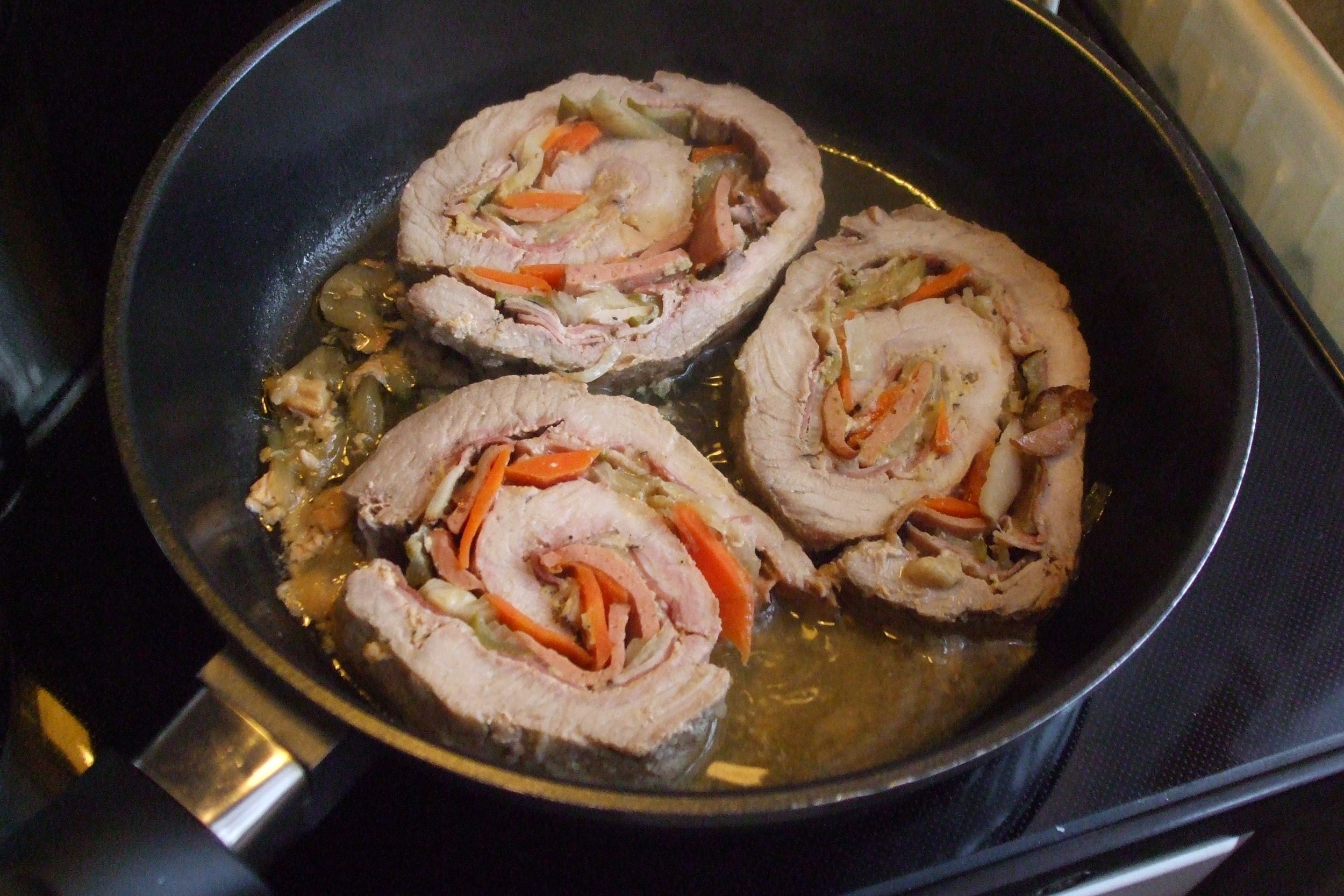 3. Na rozehřátém tuku roládu ze všech stran opečeme, pak podlijeme a pečeme v troubě. Občas přelijeme vypečenou šťávou, popřípadě doplníme trochou vody nebo vývaru.