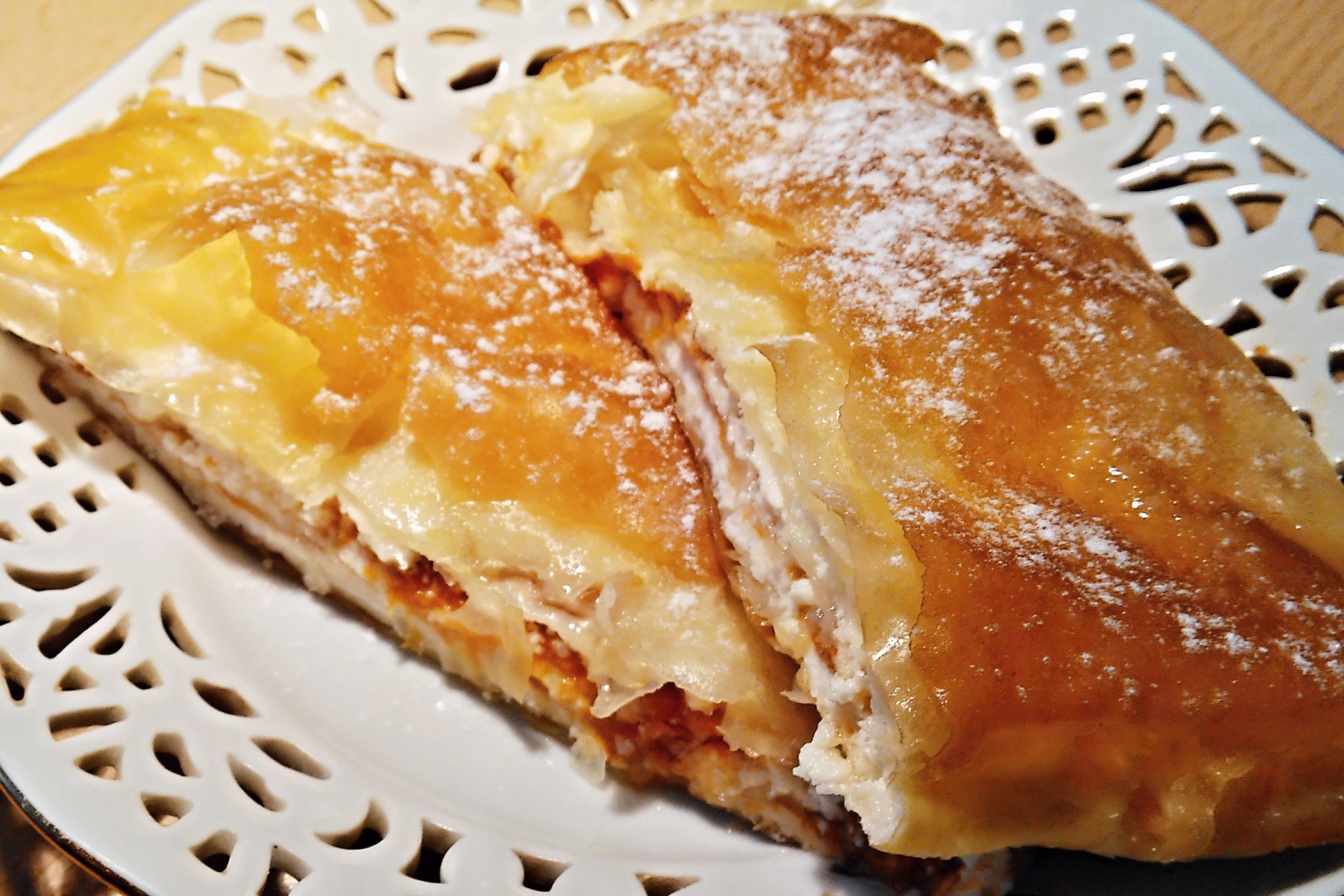Na stůl rozprostřeme čisté plátno nebo ubrus, poprášíme moukou, doprostřed položíme bochánek těsta a lehce ho rozválíme. Potom placku potřeme vlahým máslem a opatrně ho rukama vytahujeme, aby bylo velmi tenké.