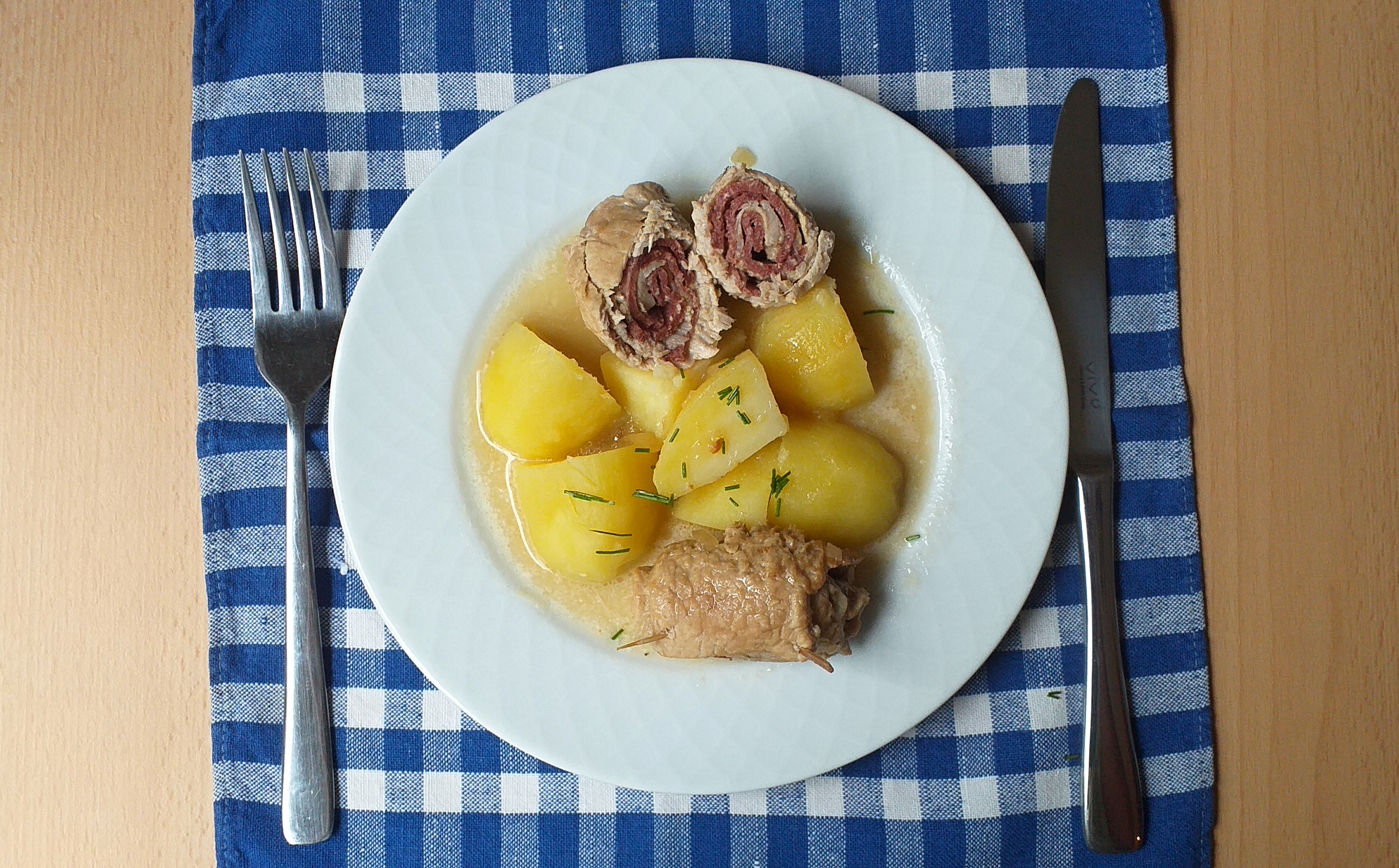 - Na sádle osmahneme nakrájenou cibuli, pak ji shrneme k okraji a opečeme ze všech stran závitky. Podlijeme horkou vodou, přidáme zelený pepř a dusíme do měkka. Chceme hustší šťávu, přidáme v závěru trošku hladké mouky rozmíchané ve studené vodě a provaříme.