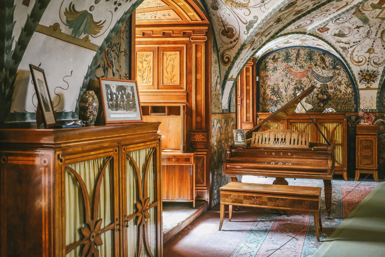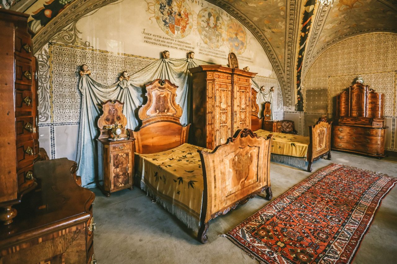 Ložnice je velká jak konferenční sál, vše je vyřezávané v jednotném stylu. V roce 1926 jel kolem na pracovní cestu T. G. Masaryk. „Přespal tu jako host. Měl kávu a švestkové knedlíky, někde se dochoval i jídelní lístek,“ líčí Lenka Bartoňová.