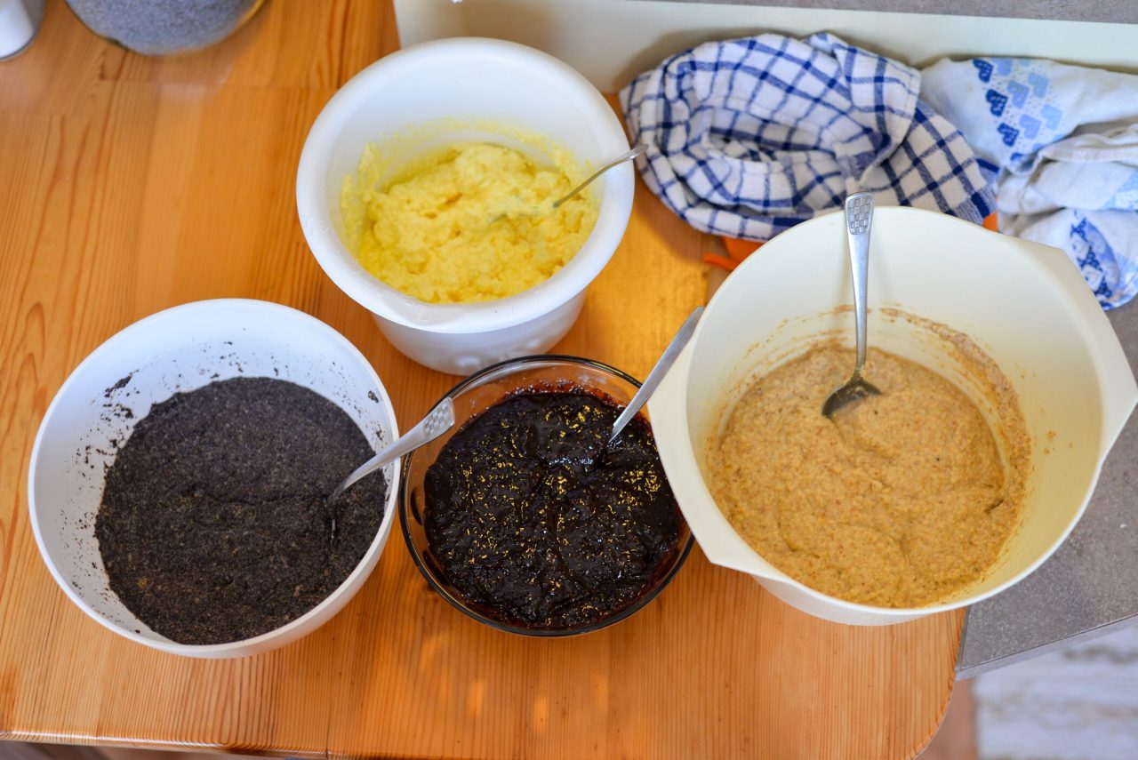 Každou náplň zvlášť dáme do cukrářského sáčku a zdobíme těsto střídavě ořechovou, makovou, tvarohovou a povidlovou náplní. Začínáme ve středu koláče, kde uděláme kroužek z první náplně. Pak kolem ní do kruhu zdobíme postupně dalšími náplněmi, až dosáhneme okraje těsta.