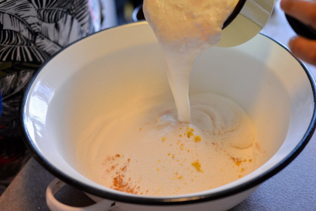 Do mísy dáme prosátou mouku, muškátový květ a citronovou kůru. Přidáme vykynutý kvásek připravený z 300 ml teplého mléka, 100 g cukru krystal a 50 g kvasnic.