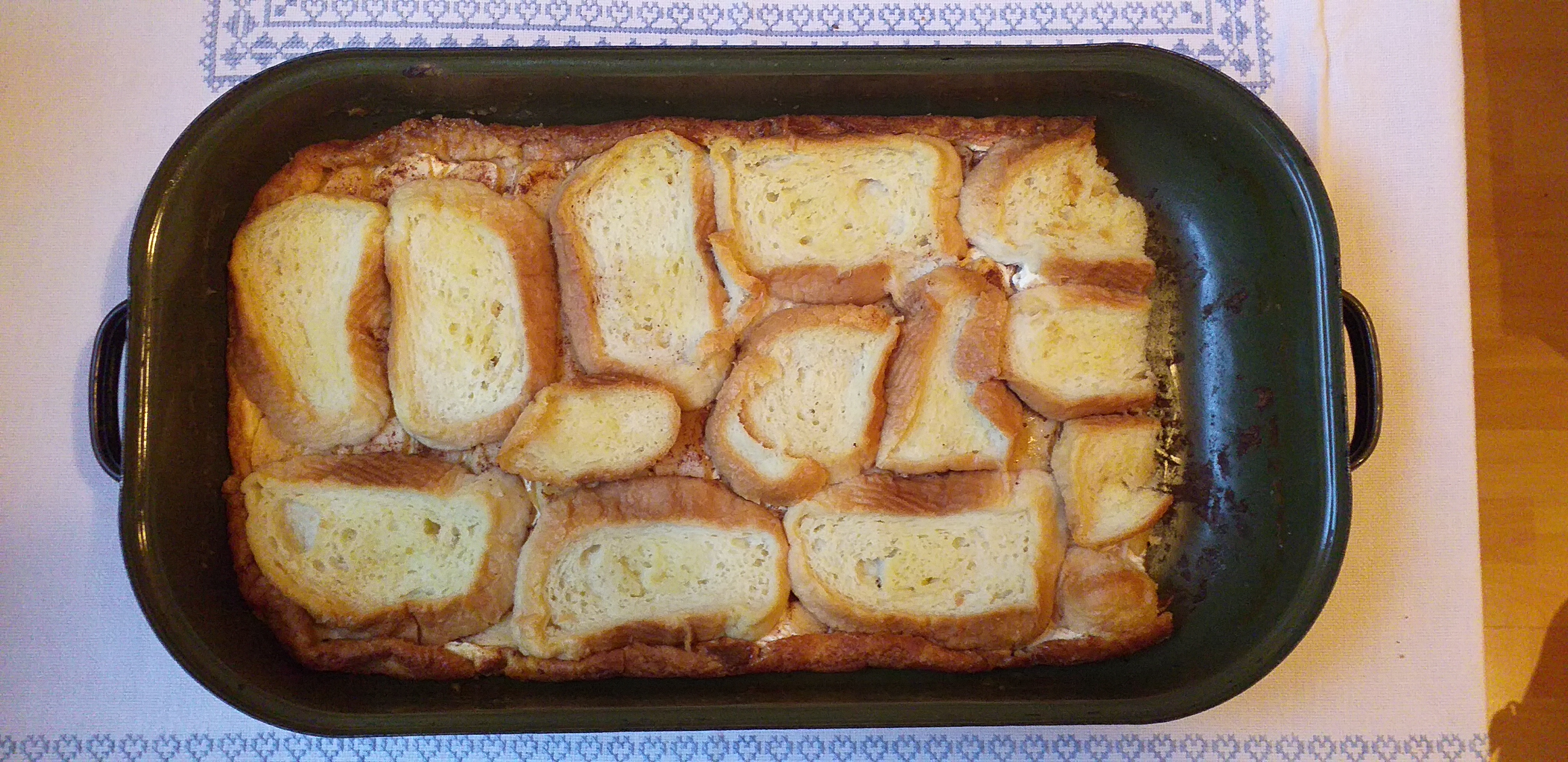 6. Končíme vrstvou plátků z veky, opět namočených v mléce a povrch ještě poklademe malými kousky másla.